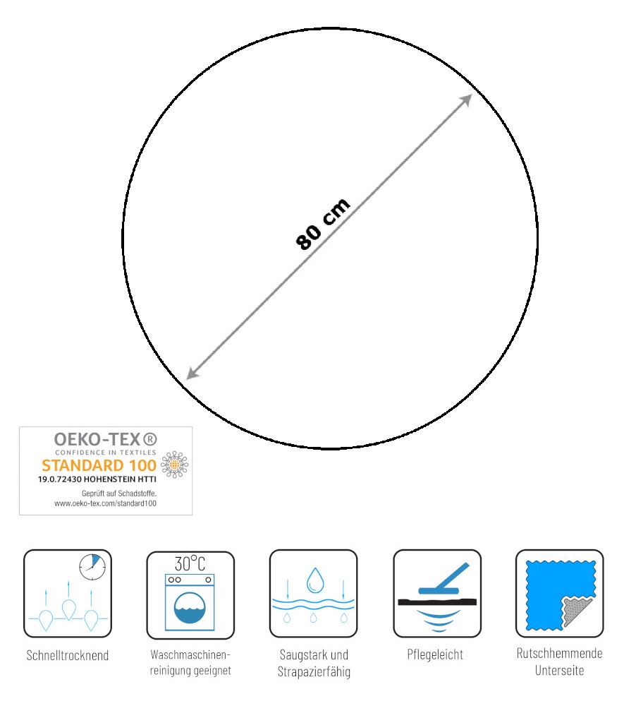 Zusätzlich zeichnet sich der Badteppich durch eine hohe Strapazierfähigkeit aus und trocknet äußerst schnell. Die Reinigung erfolgt bei bis zu 30°C in der Waschmaschine.