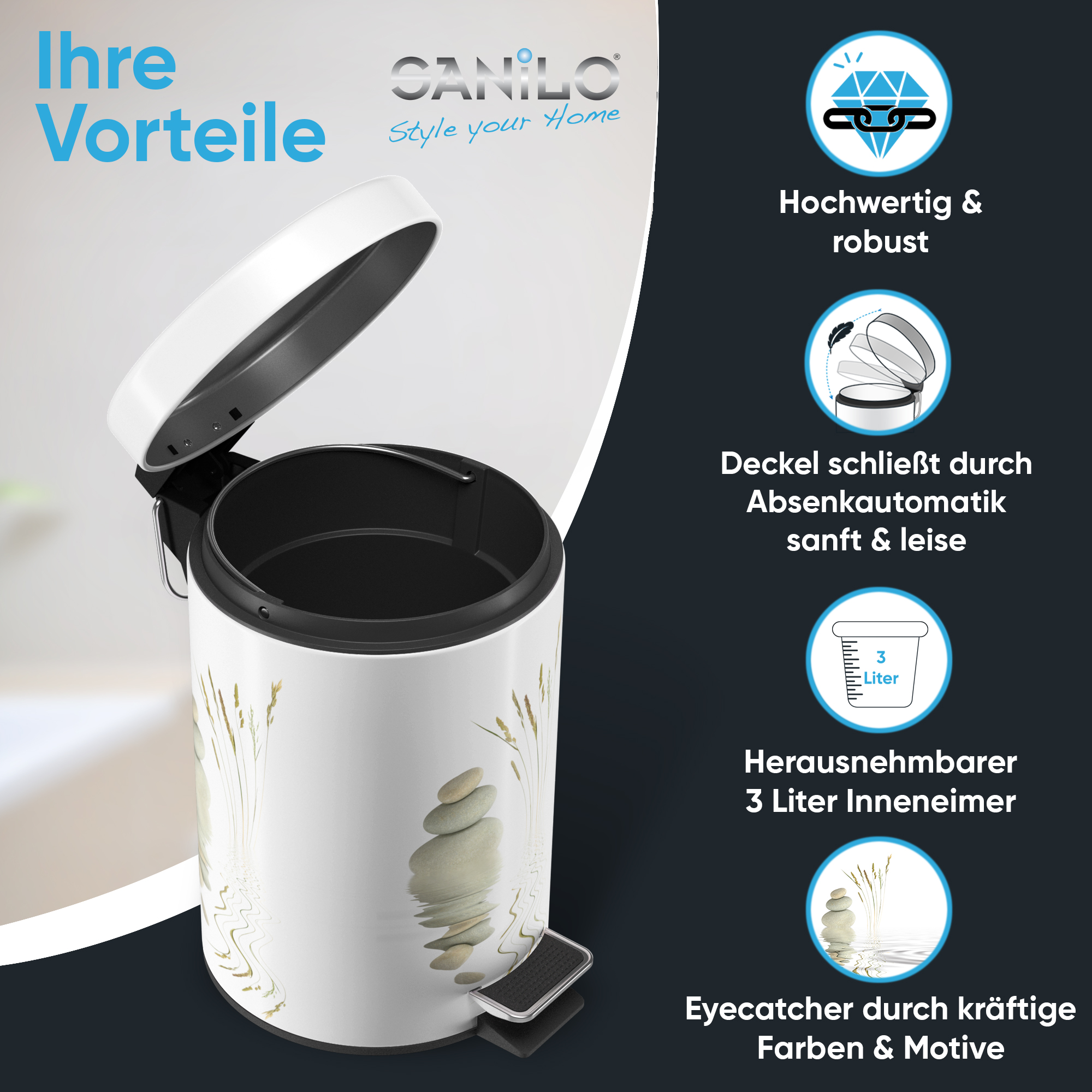 • EINZIGARTIGE DESIGNS: Die Sanilo Kosmetikeimer sind der Blickfang in jedem Badezimmer. Wählen Sie aus vielen Motiven Ihr Lieblingsdesign und bereichern Ihr Badezimmer mit einem echten Highlight.