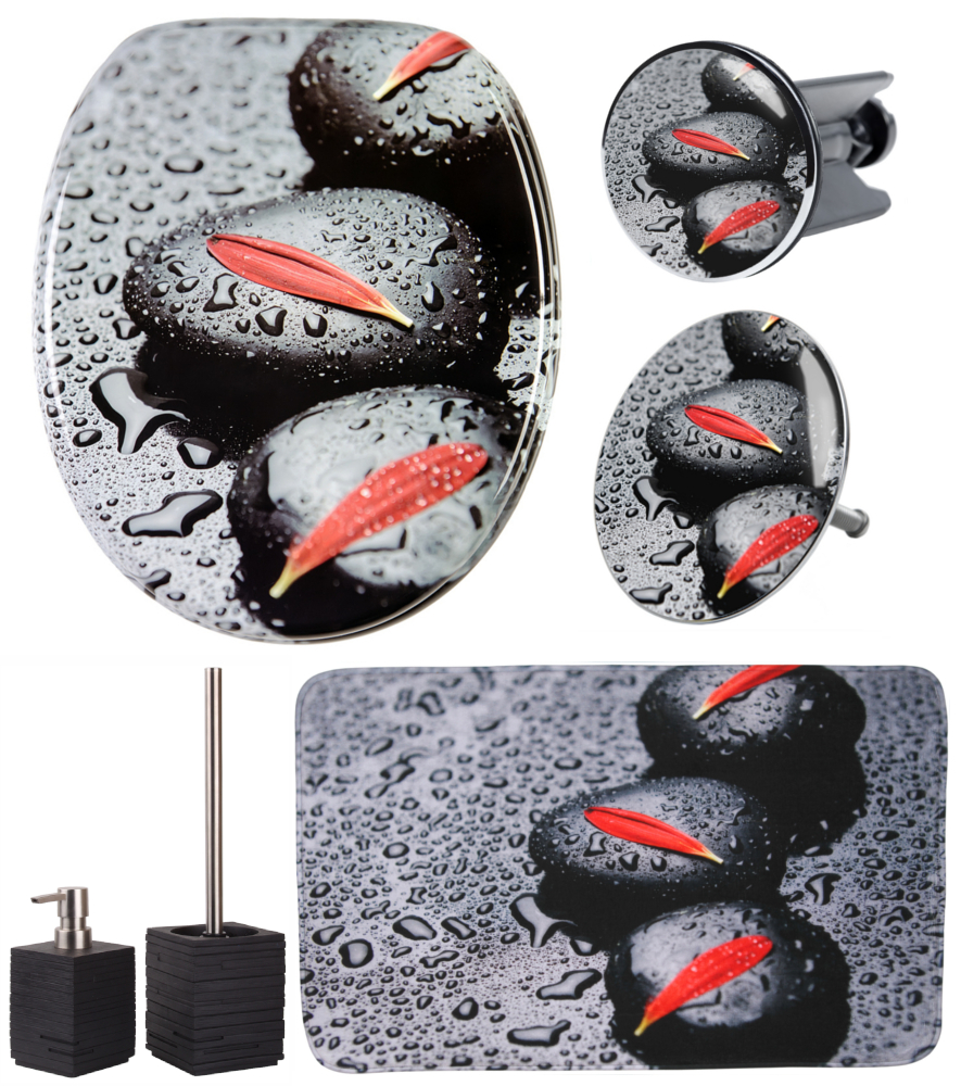 WC-Sitz, Badteppich 70 x 110 cm, Waschbeckenstöpsel, Badewannenstöpsel, Seifenspender und WC-Bürste