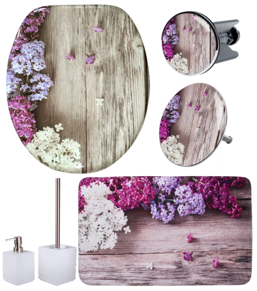 WC-Sitz, Badteppich 70 x 110 cm, Waschbeckenstöpsel, Badewannenstöpsel, Seifenspender und WC-Bürste