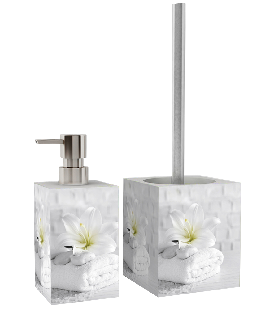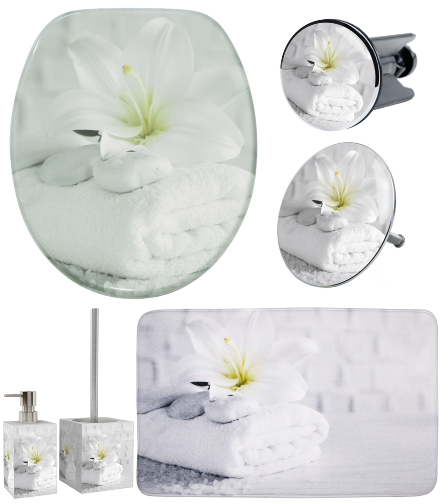 WC-Sitz, Badteppich 70 x 110 cm, Waschbeckenstöpsel, Badewannenstöpsel, Seifenspender und WC-Bürste