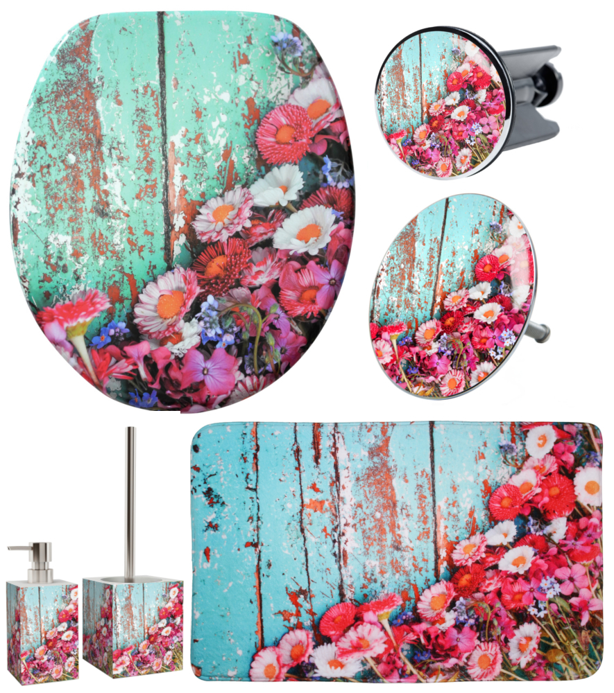 WC-Sitz, Badteppich 70 x 110 cm, Waschbeckenstöpsel, Badewannenstöpsel, Seifenspender und WC-Bürste